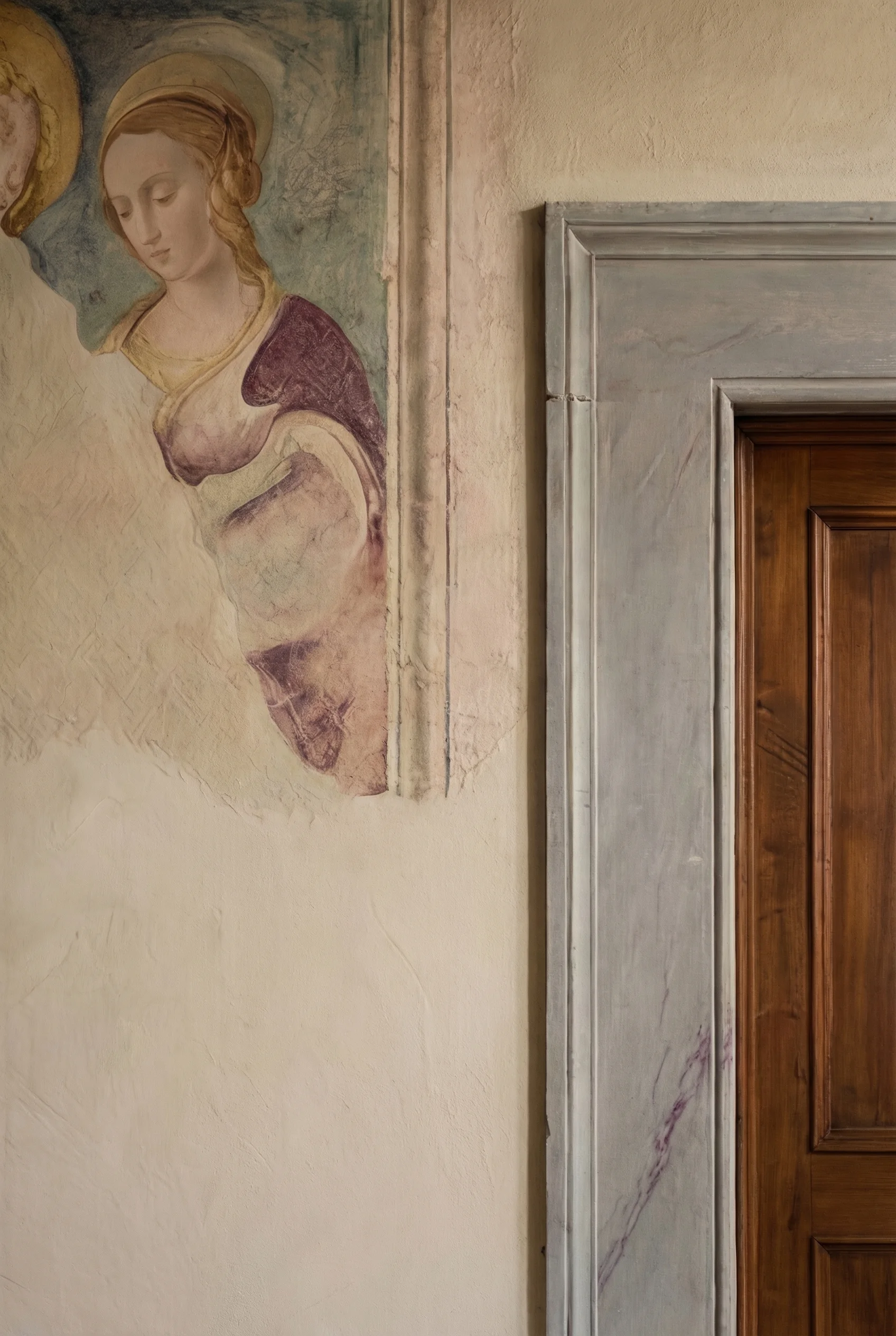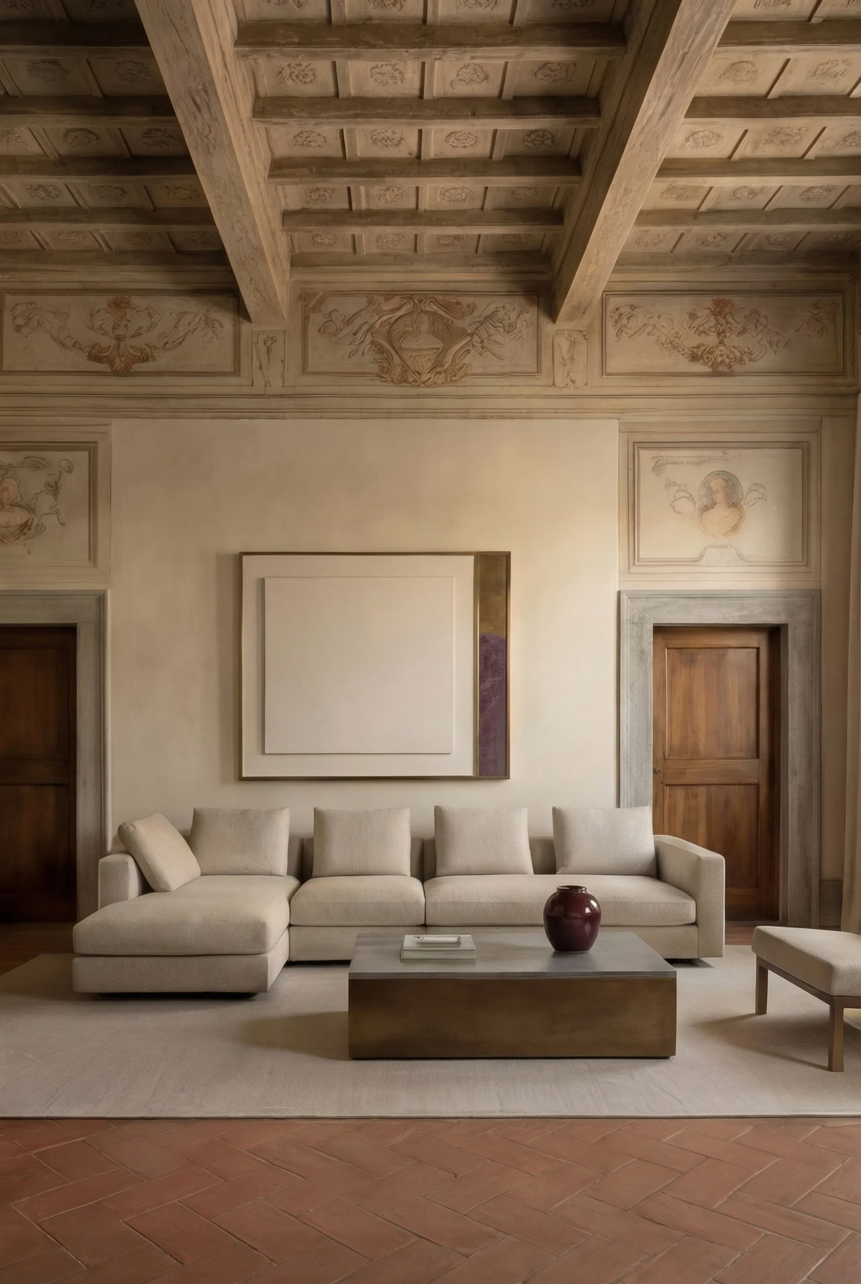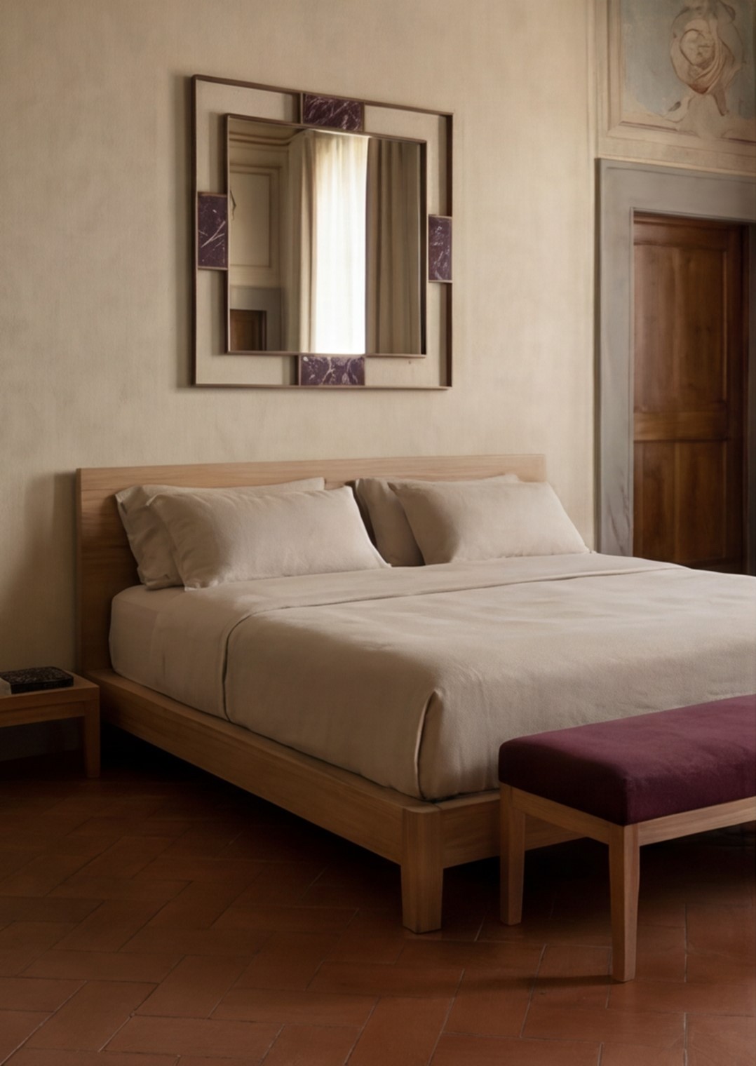 Equilibrio tra memoria e misura Il progetto interviene all’interno di un palazzo storico, preservandone la struttura originaria e i segni del tempo. Affreschi, soffitti lignei decorati e cornici in pietra vengono mantenuti come elementi identitari, senza sovrapposizioni invasive. L’intervento contemporaneo si sviluppa per sottrazione. Le superfici sono trattate con intonaci minerali chiari che amplificano la luce naturale e restituiscono continuità agli ambienti. Lo spazio, pur nella sua dimensione contenuta, è organizzato in ambiti distinti ma fluidi: area giorno, zona notte e nucleo cucina dialogano attraverso proporzioni calibrate e arredi su misura. Il disegno è essenziale, basato su volumi semplici in legno naturale e dettagli in ottone satinato. La cucina è integrata in una nicchia architettonica, con un fondale in marmo dalle venature profonde che introduce un accento materico senza alterare l’equilibrio complessivo. Il bagno prosegue la stessa logica: pietra, superfici compatte, elementi monolitici. La palette cromatica — sabbia, legno caldo, tocchi di porpora discreta — crea un’atmosfera raccolta e silenziosa. La luce radente valorizza la texture degli intonaci e sottolinea la profondità delle aperture. Il risultato è un monolocale che non cerca contrasto, ma continuità. Un interno contemporaneo che abita la storia con rispetto, misura e calma visiva.