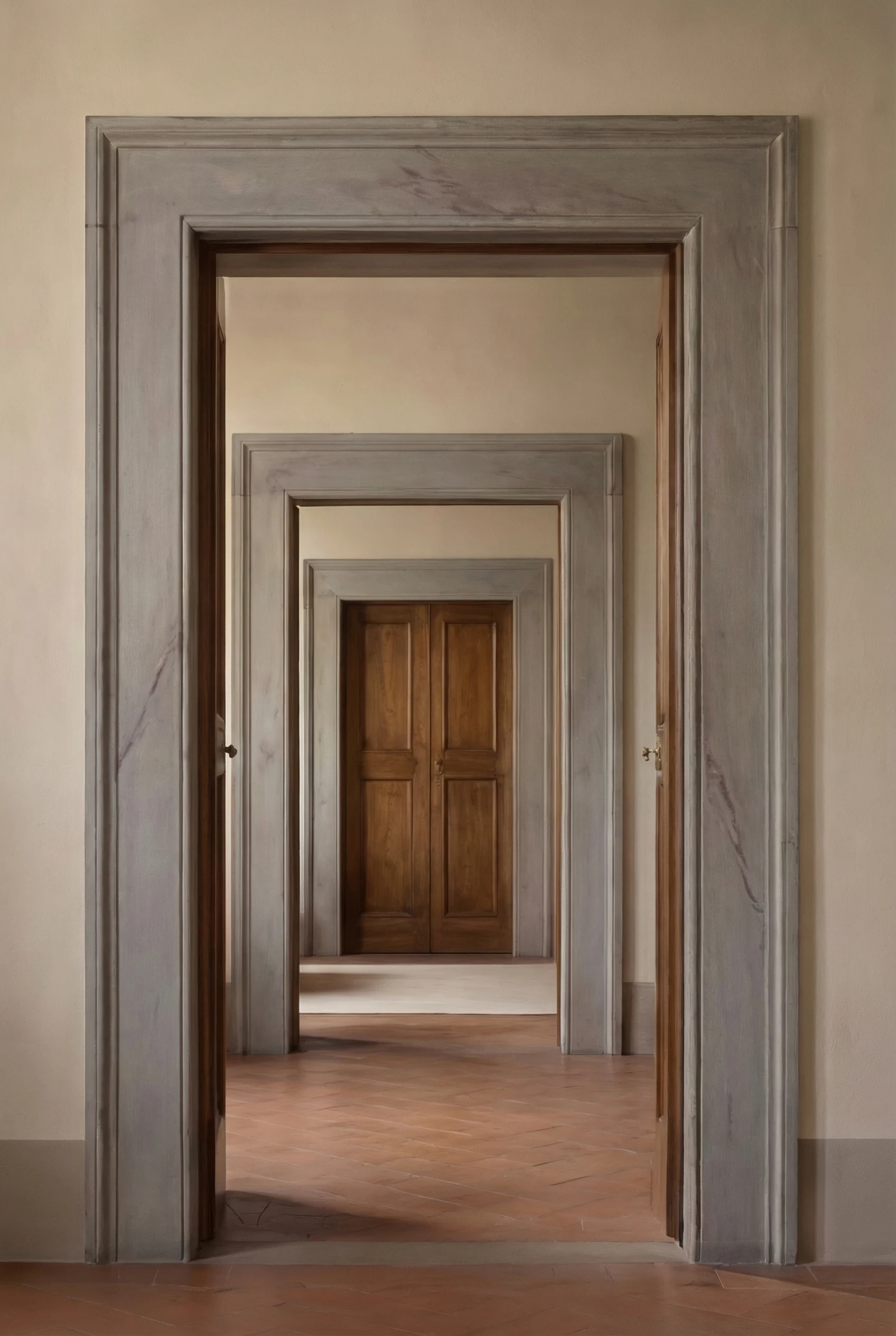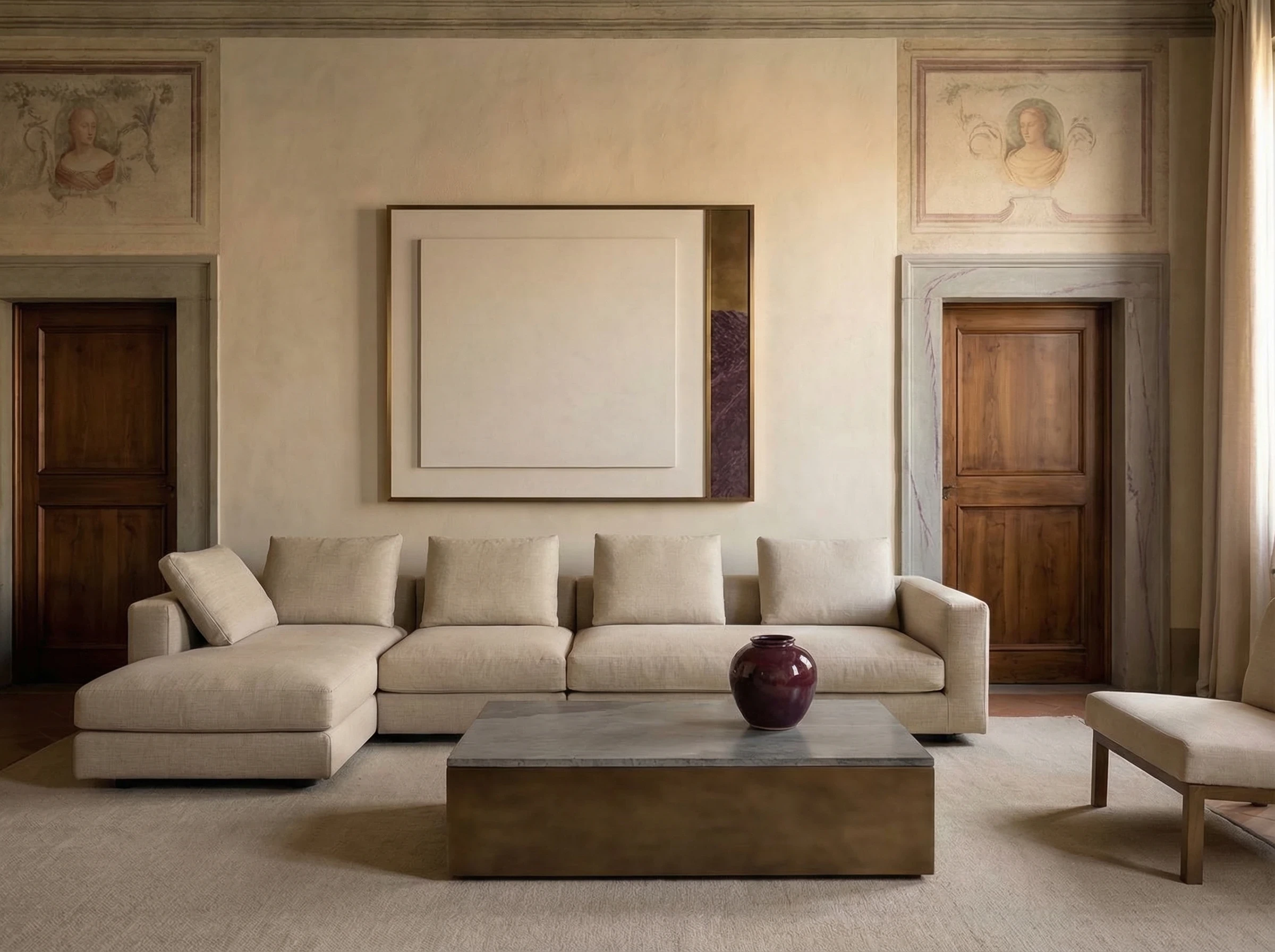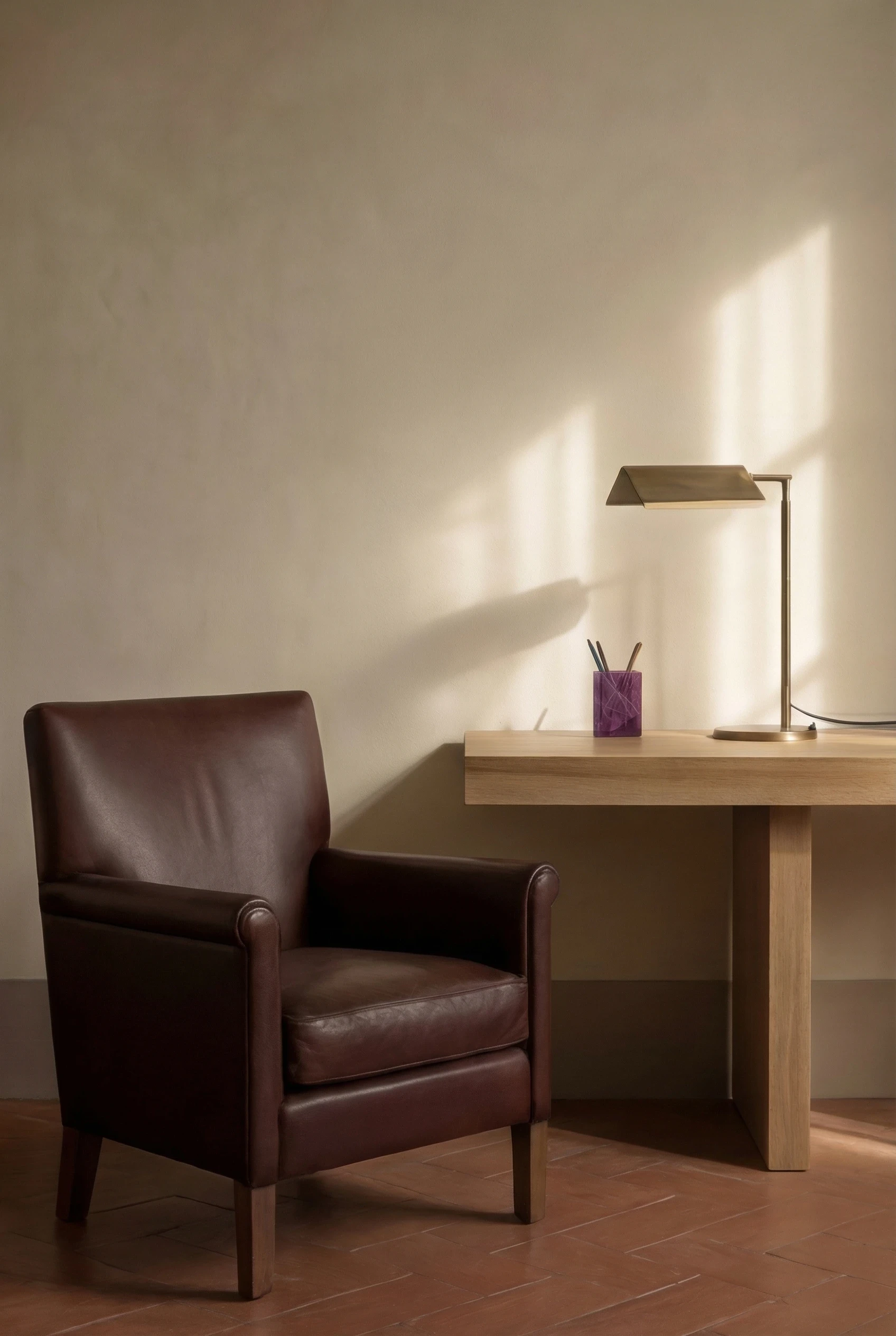 Equilibrio tra memoria e misura Il progetto interviene all’interno di un palazzo storico, preservandone la struttura originaria e i segni del tempo. Affreschi, soffitti lignei decorati e cornici in pietra vengono mantenuti come elementi identitari, senza sovrapposizioni invasive. L’intervento contemporaneo si sviluppa per sottrazione. Le superfici sono trattate con intonaci minerali chiari che amplificano la luce naturale e restituiscono continuità agli ambienti. Lo spazio, pur nella sua dimensione contenuta, è organizzato in ambiti distinti ma fluidi: area giorno, zona notte e nucleo cucina dialogano attraverso proporzioni calibrate e arredi su misura. Il disegno è essenziale, basato su volumi semplici in legno naturale e dettagli in ottone satinato. La cucina è integrata in una nicchia architettonica, con un fondale in marmo dalle venature profonde che introduce un accento materico senza alterare l’equilibrio complessivo. Il bagno prosegue la stessa logica: pietra, superfici compatte, elementi monolitici. La palette cromatica — sabbia, legno caldo, tocchi di porpora discreta — crea un’atmosfera raccolta e silenziosa. La luce radente valorizza la texture degli intonaci e sottolinea la profondità delle aperture. Il risultato è un monolocale che non cerca contrasto, ma continuità. Un interno contemporaneo che abita la storia con rispetto, misura e calma visiva.